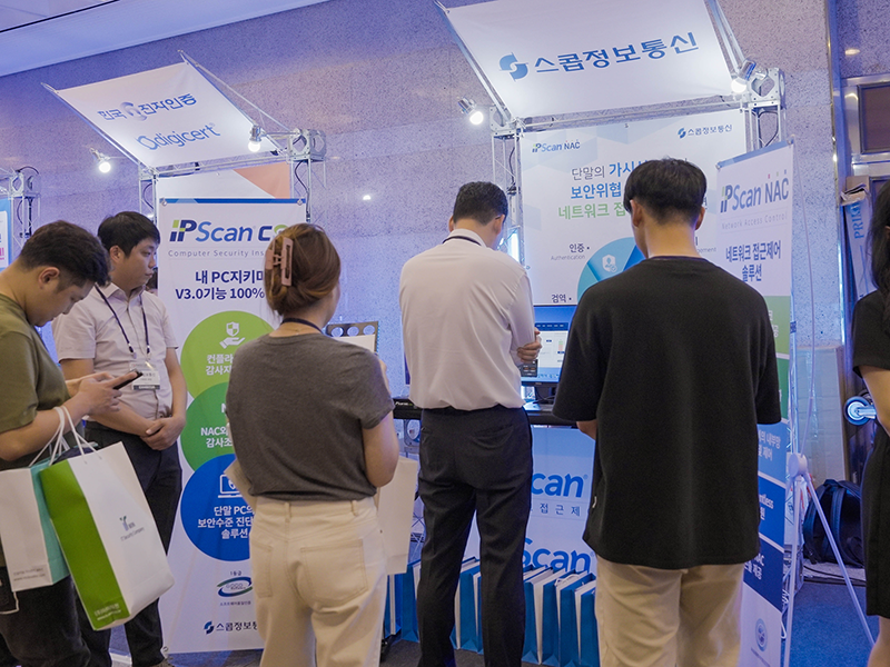 공공, 금융, 기업 정보보안 및 개인정보보호 책임자(CISO, CPO), 실무자 등 전국의 보안담당자 1,000여 명이 참석한 가운데, 스콥정보통신은 네트워크 접근제어 솔루션 ‘아이피스캔NAC(IPScan NAC)’, PC보안수준진단 솔루션 '아이피스캔CSI(IPScan CSI)'를선보였습니다. 특히, 이번 전시회에서는 기존 아이피스캔NAC V7.0을 통해 기대하는 고객의 요구사항을 적극 반영하여 보안성을 강화하고 사용자 편리성을 증대시킨 ‘아이피스캔NAC V8.0’을 선보이며 네트워크 관리, 보안 시장의 선두 기업으로 자리매김하고 있음을 홍보하였습니다.